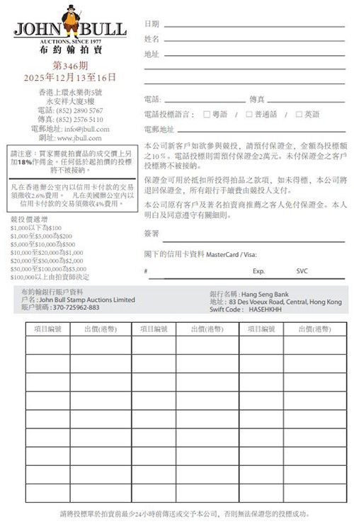 投標價不得低於起標價,得標各項按成交價另加18%予布約翰拍賣以作為佣金。